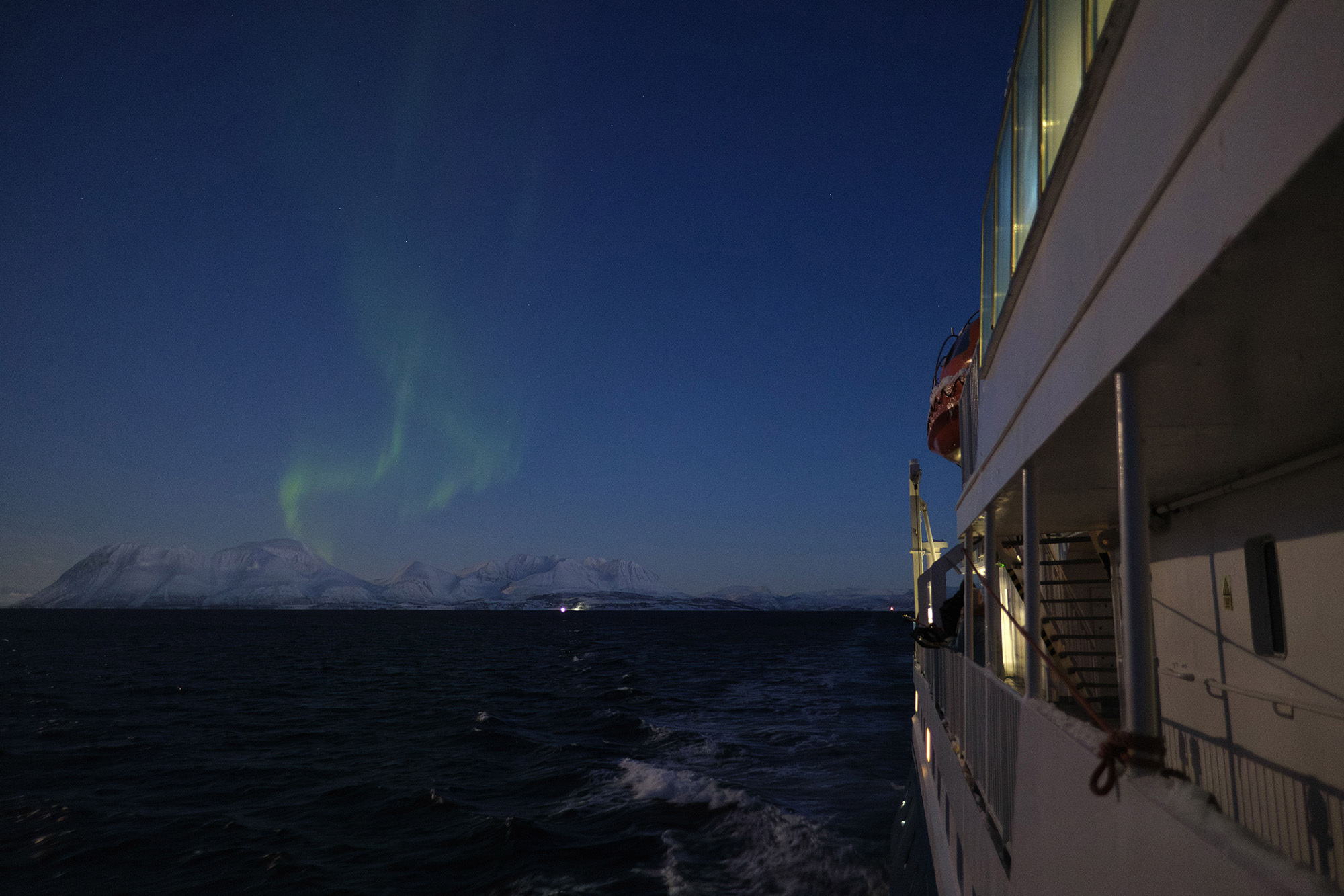 Our all-inclusive package ensures that you have everything you need from the moment you step on board. A comfortable ocean facing cabin, delicious food, needed winter gear, whale watching and Northern Lights chase. The large ship ensures more stability on the sometimes rough waters, reducing the chances of getting seasick.