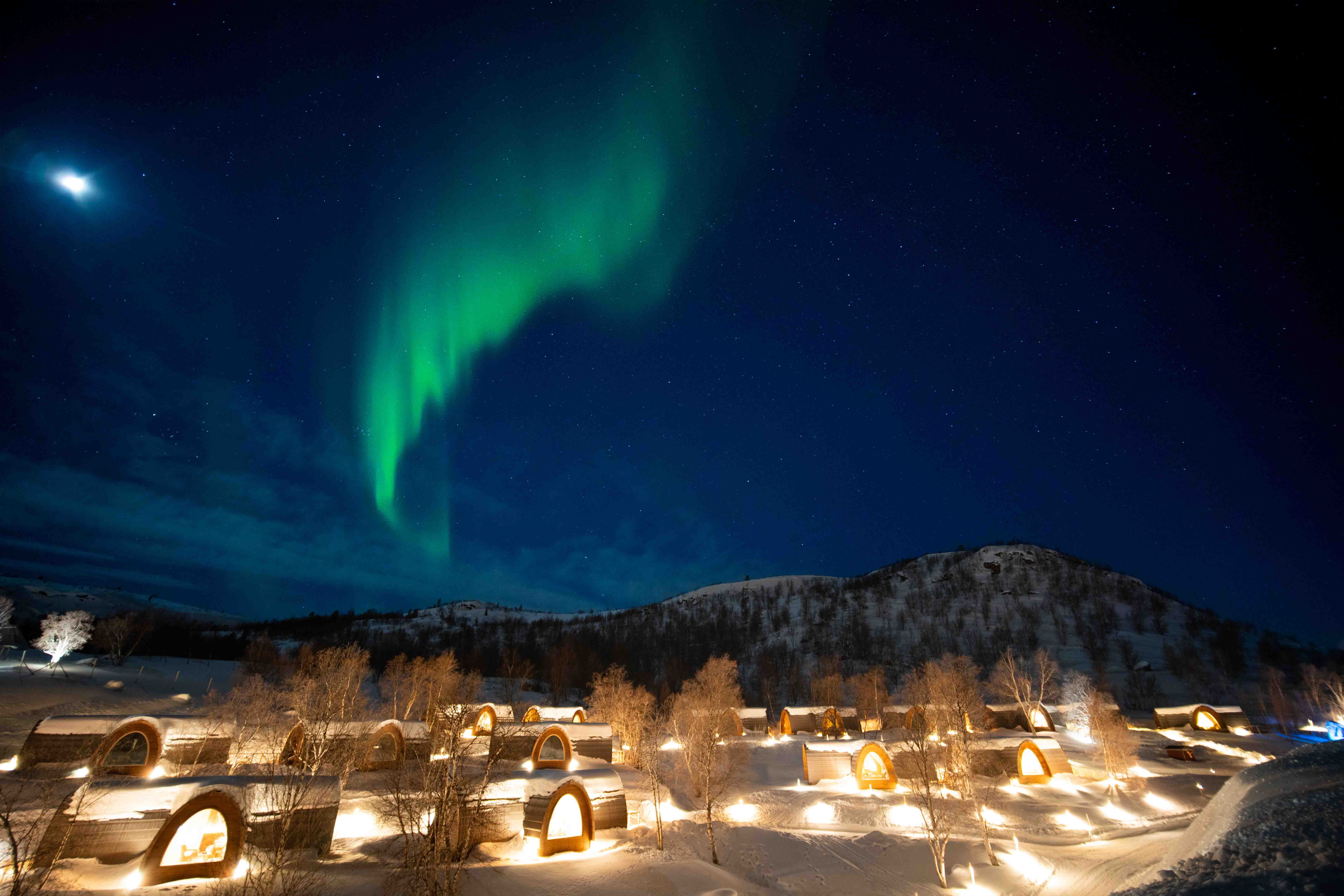 Våre trehytter i Gamme-stil er inspirert av tradisjonelle samiske jakt- og fiskehytter som en gang fantes dypt inne i Lapplands villmark. Hyttene er laget for å gli naturlig inn i omgivelsene, og komplementere det rå landskapet i stedet for å konkurrere med det. Mange gjester beskriver vår lille skogslandsby som noe hentet fra Tolkiens Hobbiton; et sted som føles magisk, fredelig og litt uvirkelig.