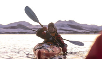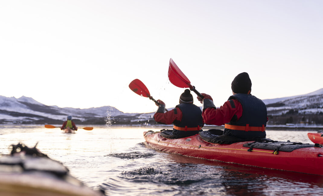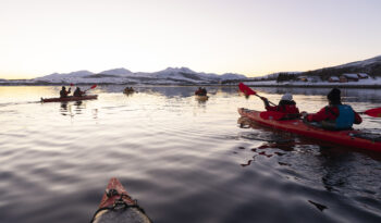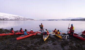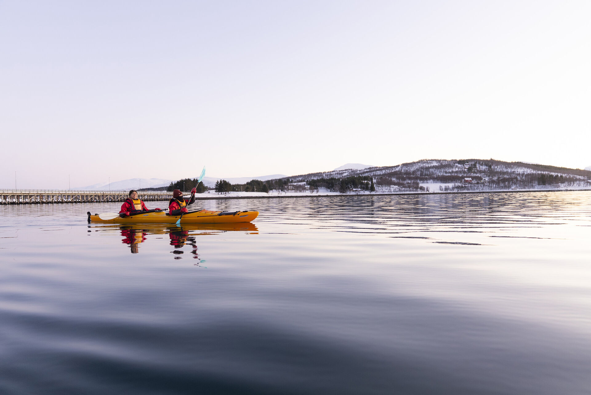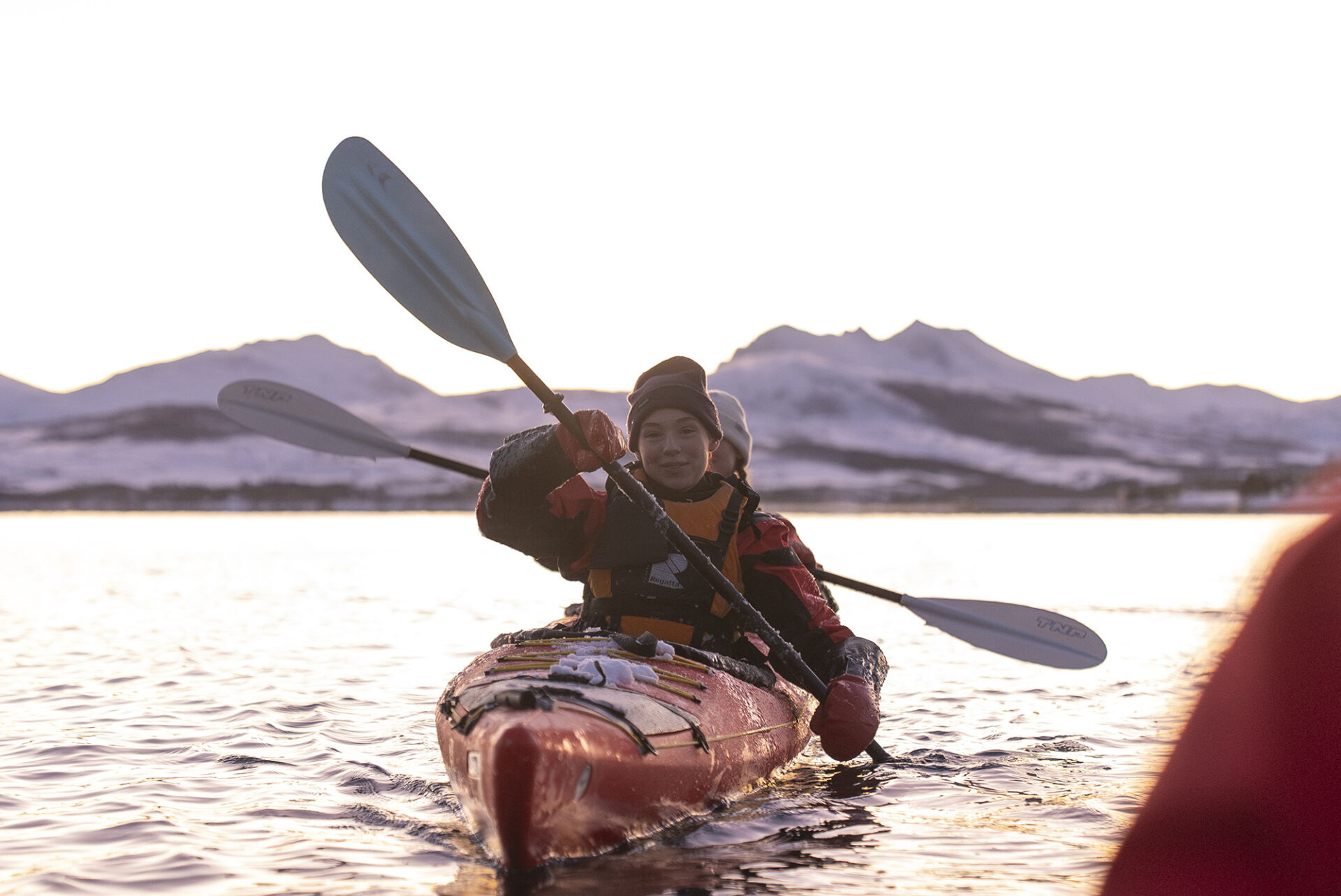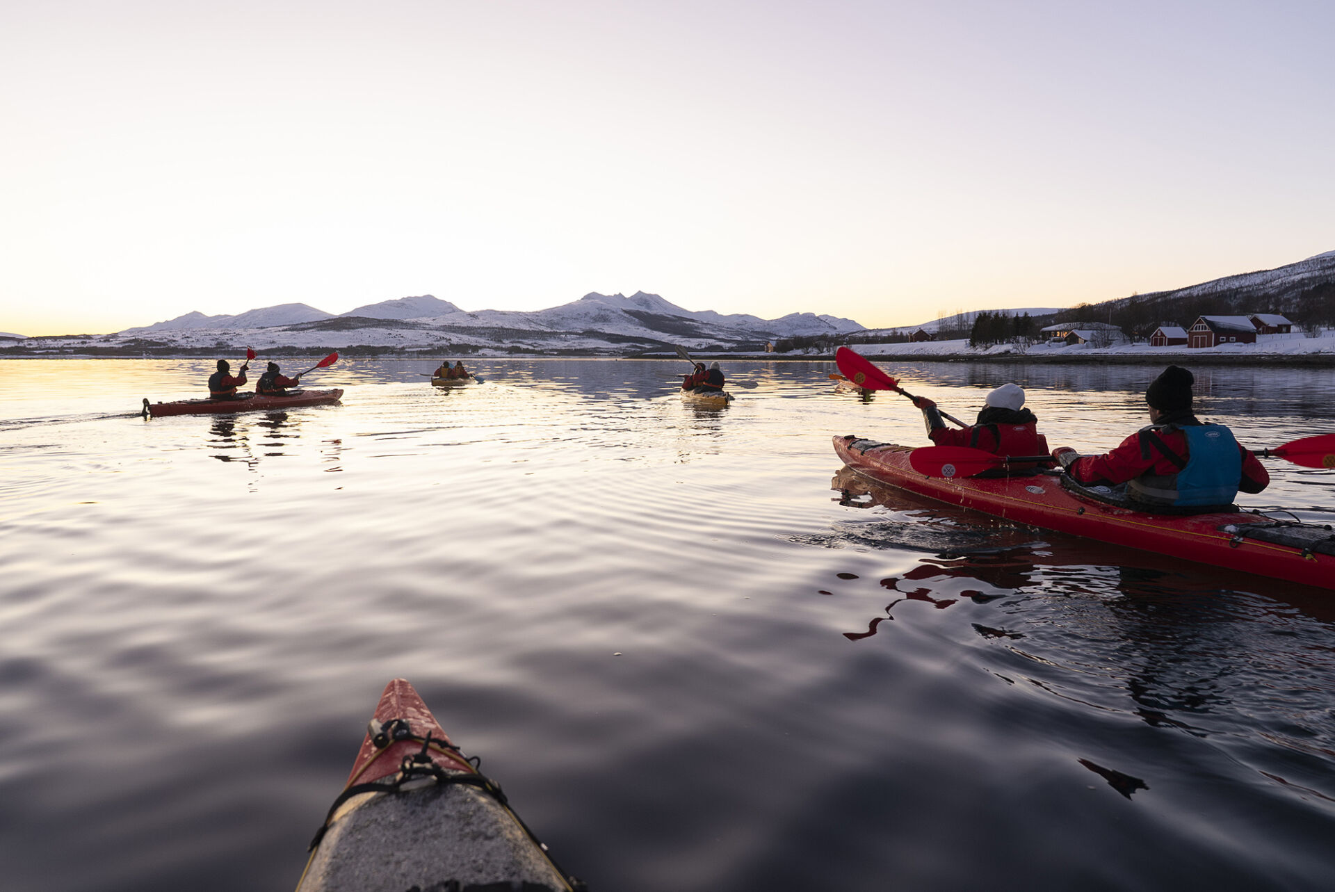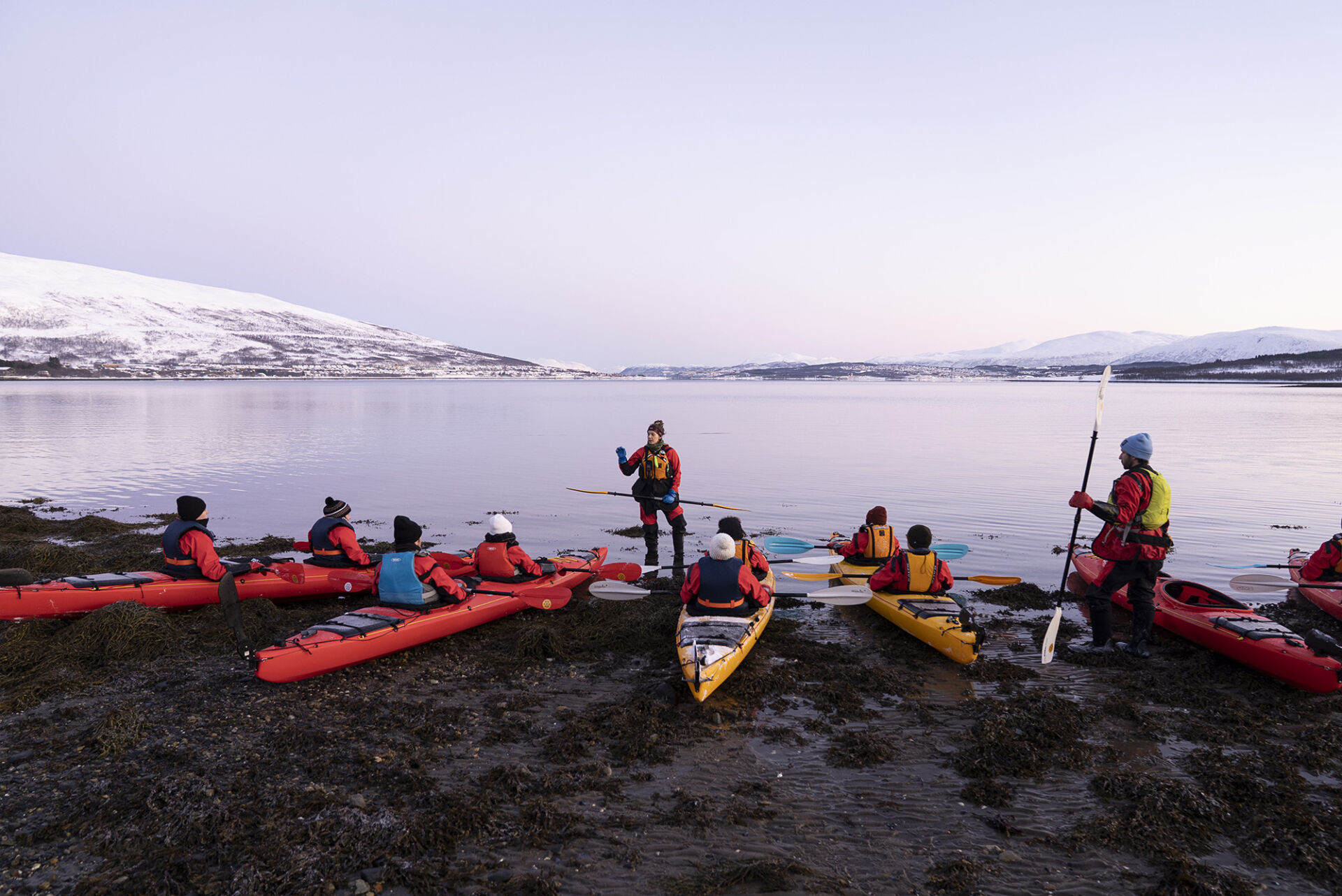 Når du har fått på deg klærne, går du ned til strandlinjen og setter deg i kajakken. Før du drar ut, vil guiden din gi deg enkle padleinstruksjoner og en grundig sikkerhetsbriefing. Om vinteren padler du vanligvis stabile doble kajakker, men enkeltkajakker vil være tilgjengelige på forespørsel hvis du kan vise tilstrekkelig kajakkpadlingserfaring.