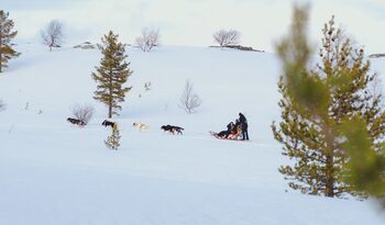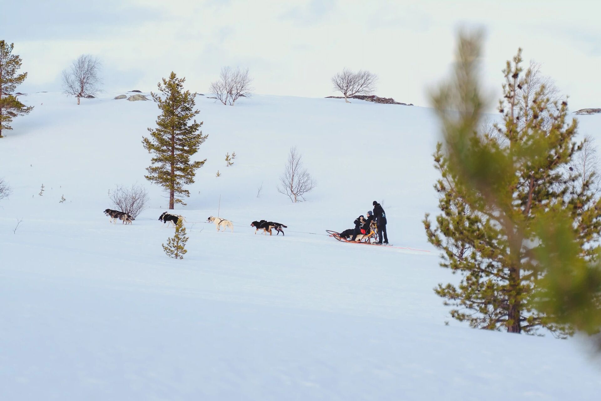 Etter å ha blitt utstyrt med en varm termodress og støvler som guidene våre har med seg, setter du deg ned i en kjelke sammen med en medpassasjer. Ruten tar deg over snødekte fjell og langs naturskjønne vinterlandskap. Kjelketuren tar omtrent 45 til 60 minutter, avhengig av vær og løypeforhold. Mens du nyter turen, blir bagasjen din transportert med bil og venter på deg i resepsjonen på Snowhotel ved ankomst.